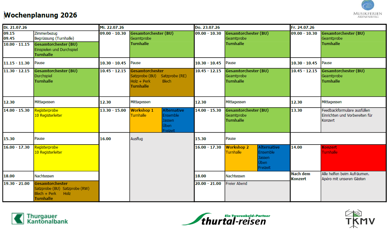 Am letzten Tag der Musikferien wird am Nachmittag gegen 14:00 Uhr ein Schlusskonzert in der Mehrzweckhallen stattfinden. Anschliessend sind alle Teilnehmer und Besucher zum Apéros eingeladen.